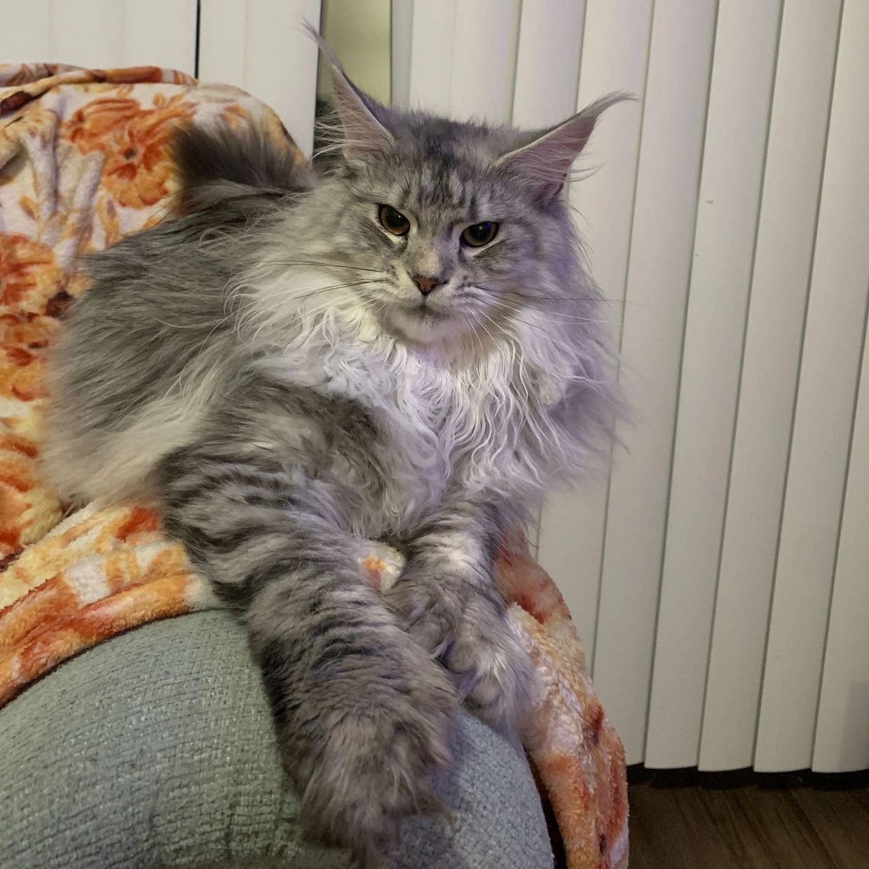 Astrid is happiest lounging near people, following us from room to room, and observing everything with her calm, watchful presence. Her kittens often inherit her laid-back, affectionate personality and majestic appearance.