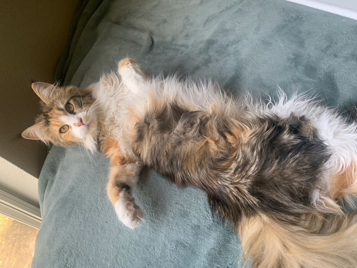 Pebbles is our mischievous and affectionate tortoiseshell Maine Coon queen, originally from Northern California. She brings nonstop personality to our cattery, always chirping, exploring, and ready to charm visitors with her bold, social nature.