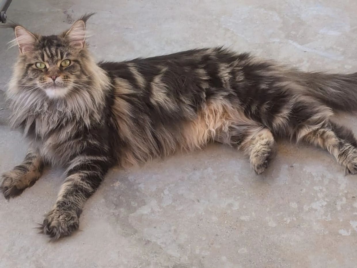 Astrid is our sweet and gentle Brown Classic Maine Coon queen, known for her luxurious mane, prominent lynx tips, and striking tabby pattern. She’s our largest female, with an impressive build and a heart to match.