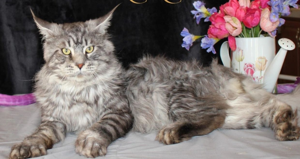 Ridgely is our handsome silver mackerel polydactyl Maine Coon stud, known for his bold pattern, extra toes, and irresistible goofball personality. Originally from Switzerland, Ridgely combines international lineage with a playful and loving spirit.