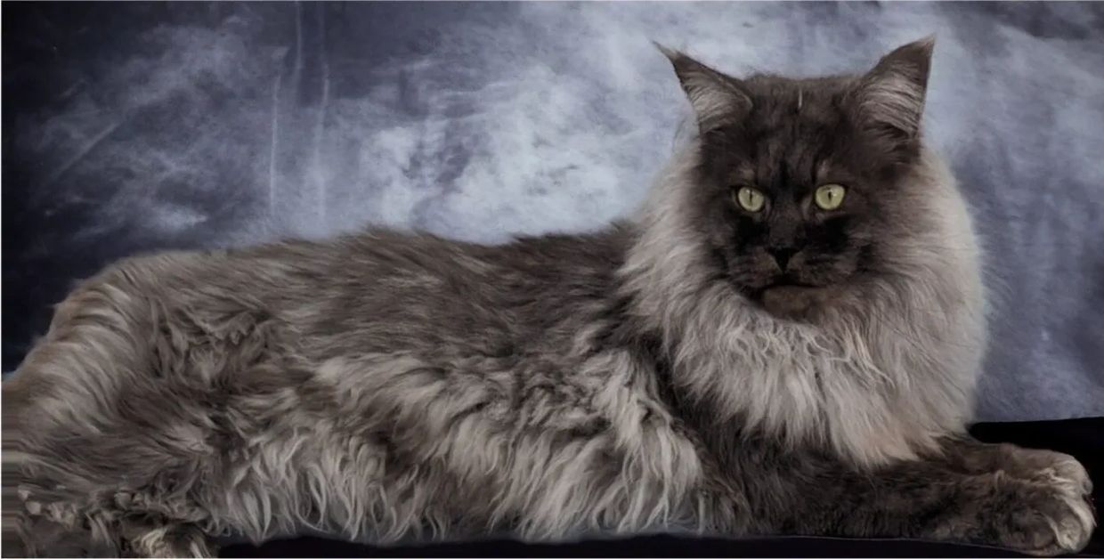 Remington is our huge black smoke Maine Coon stud, weighing in at an impressive 25 pounds. Originally from Austin, Texas, Remington turns heads with his striking smoke coat, powerful build, and regal demeanor.